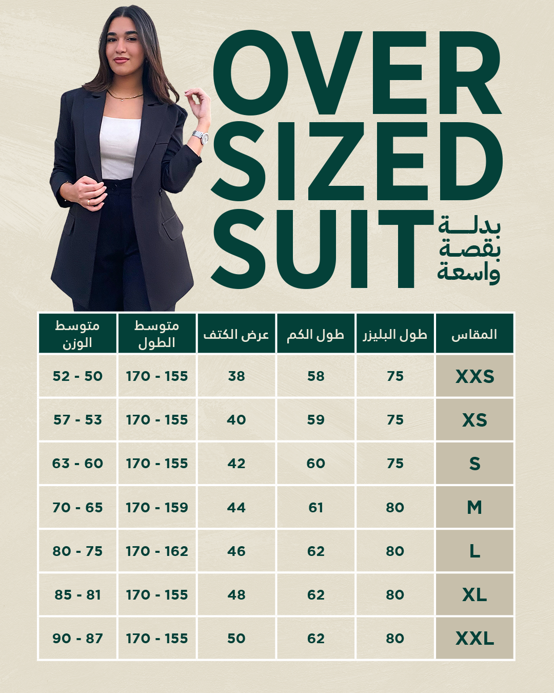 البدلة دي بقى قصتها اوفر سايز وبتيجي معانا ببليزر طويل بيوصل طوله لـ (80 سم) ومن المميز كمان انك تقدري تختاري مابين كذا قصة من البنطلونات واللى بيكونوا مناسبين تماما لشكل البليزر .